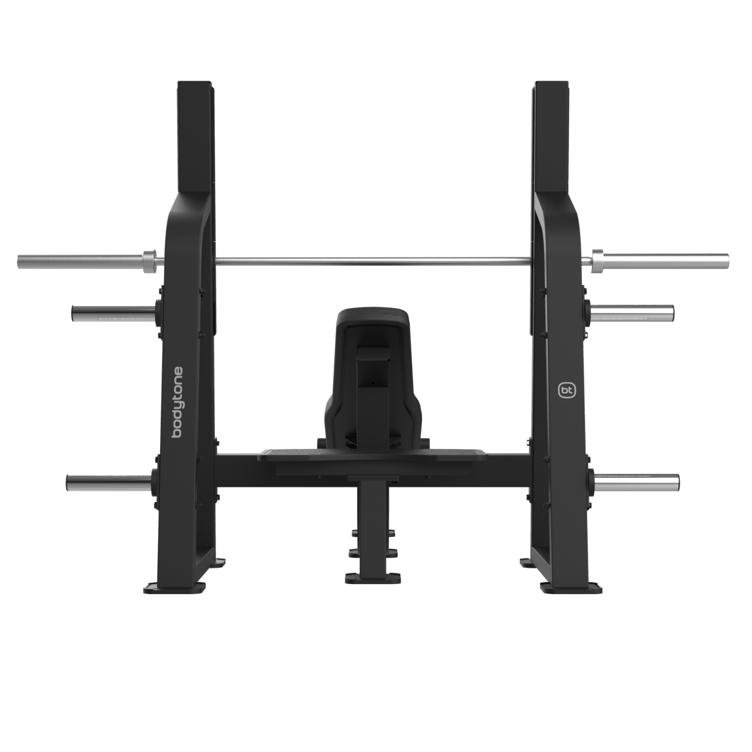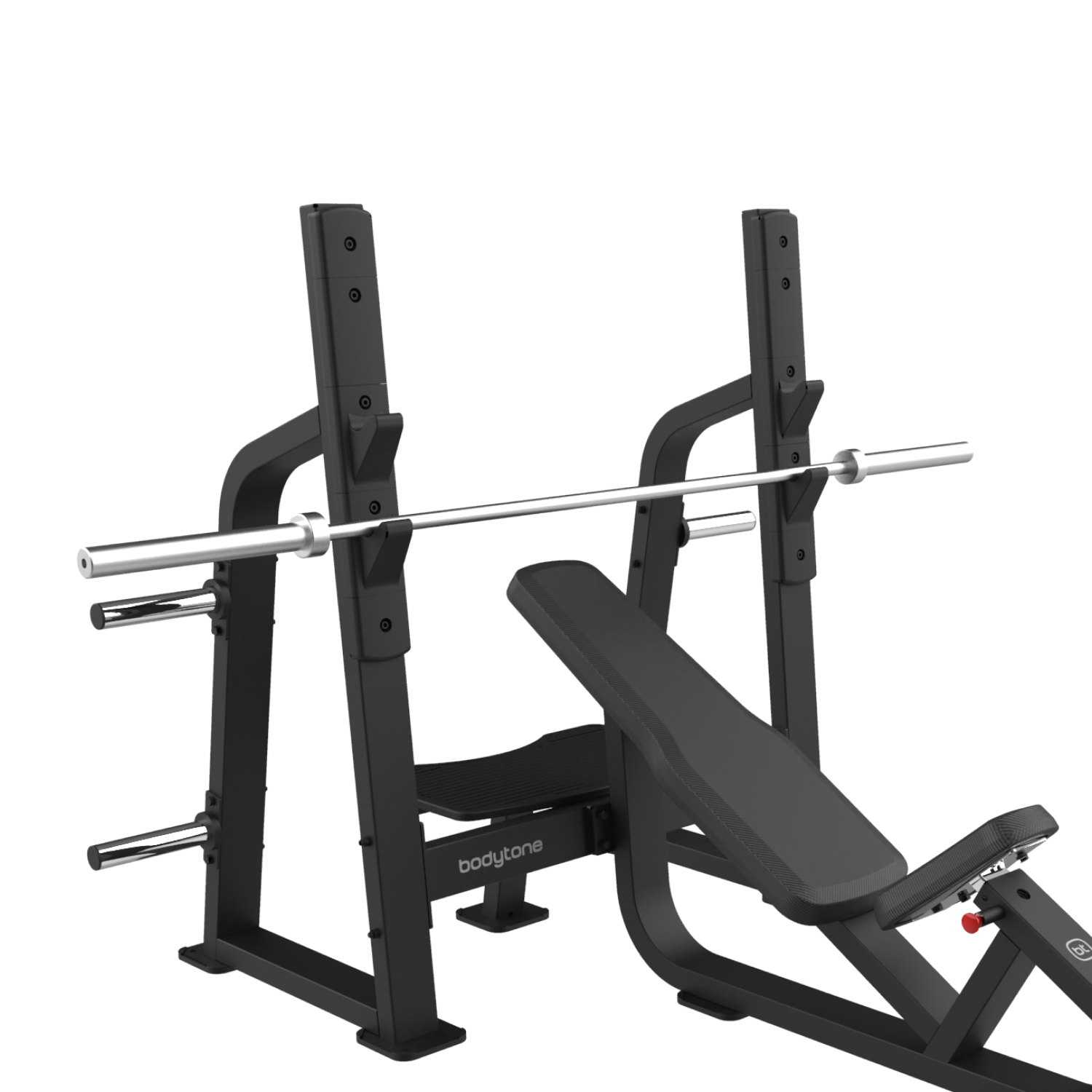 - Soportes de carga de discos: 4 soportes cromados de carga de discos olímpicos de 48mm diámetro y 230 mm de ancho. tope de goma protector.