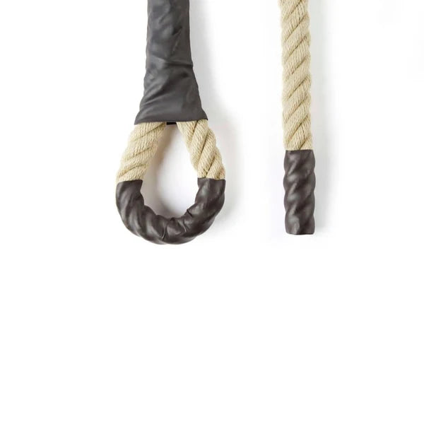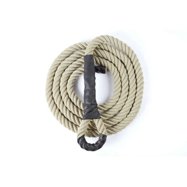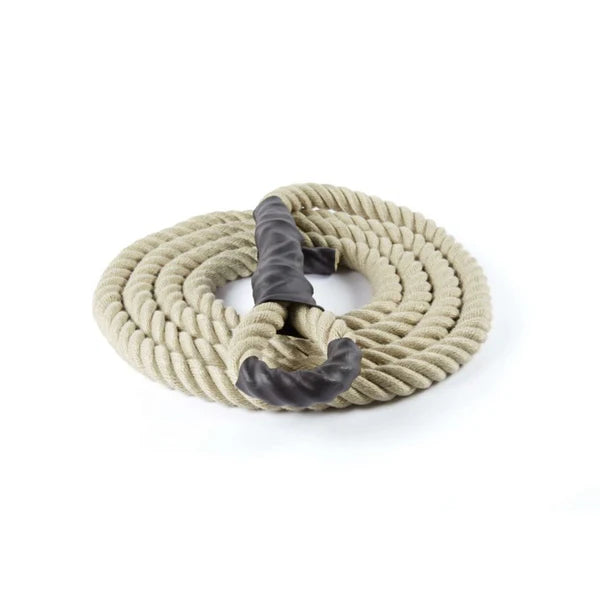 La cuerda está fabricada con manila sintética trenzada y pulida, que simula el cáñamo natural, ofreciendo una mayor resistencia y durabilidad, especialmente en condiciones húmedas o al aire libre. Este material garantiza un rendimiento consistente y prolongado, adaptándose a entrenamientos exigentes.