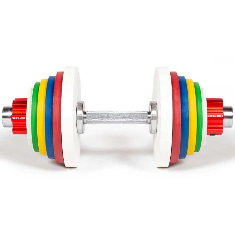 The Singular WOD Fractional Disc Dumbbell weighs in at 6.8kg and is a great item to work out on the go or in tight spaces. A compact, versatile and new way to save space in the gym, box or fitness center. The Singular WOD adjustable dumbbell for fractional discs is sold individually and is loaded with weights from our line of fractional discs, you decide the weight!