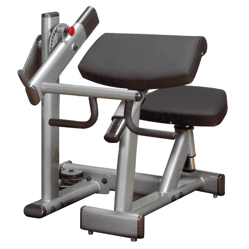 The Body-Solid Pro Dual Bicep/Tricep Machine provides a seamless switch from bicep to tricep exercise with dual grip handles. The adjustable seat and upper arm pad are designed to align the elbow with the axis of rotation of the lift arm. The handle of the machine rotates to improve user comfort.