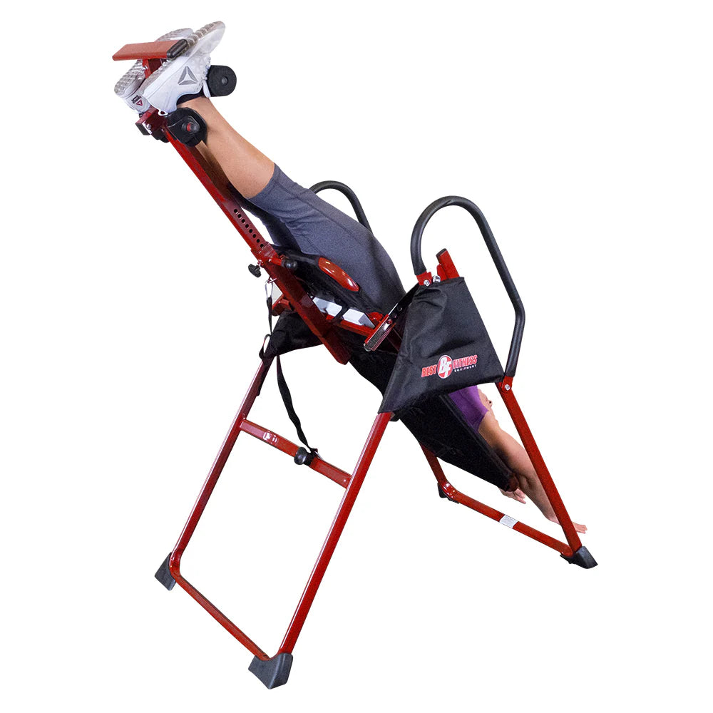 Provides continuous back support thanks to its long surface and absorbent material. The backrest can be tilted freely. It incorporates a length-adjustable strap to block the rotation of the backrest and adjust the desired inclination. Comfortable footrests with combined system. The most complete inverter on the market that allows you to stretch, relax and strengthen your back and muscles.