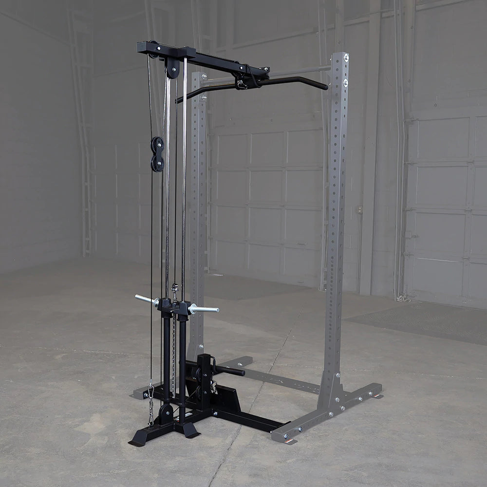 Este accesorio permite a los usuarios realizar varios ejercicios de polea alta y baja en su medio estante, incluidos jalones laterales, filas, flexiones de bíceps, encogimientos de hombros y más.