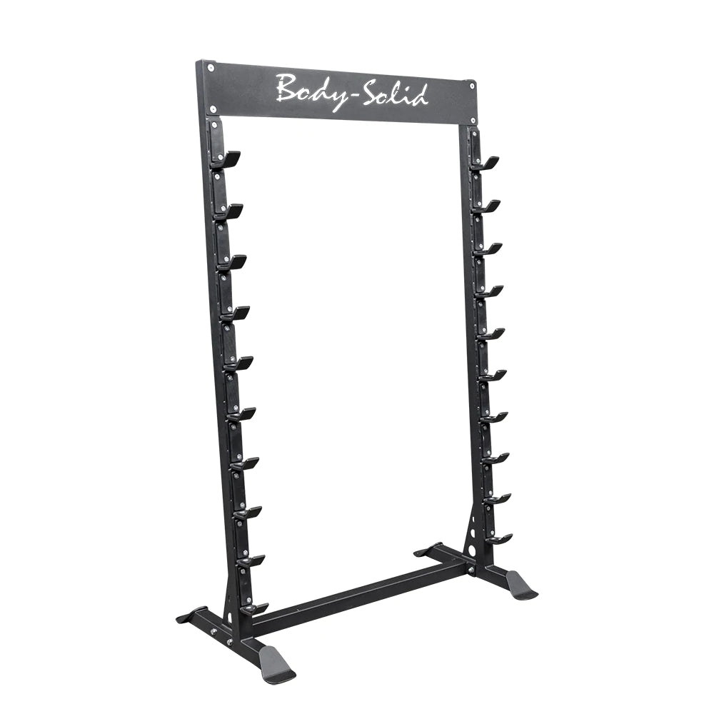 El estante de barra horizontal Body-Solid Pro Clubline SBS100 proporciona almacenamiento conveniente y de fácil acceso para hasta 10 pesas olímpicas.