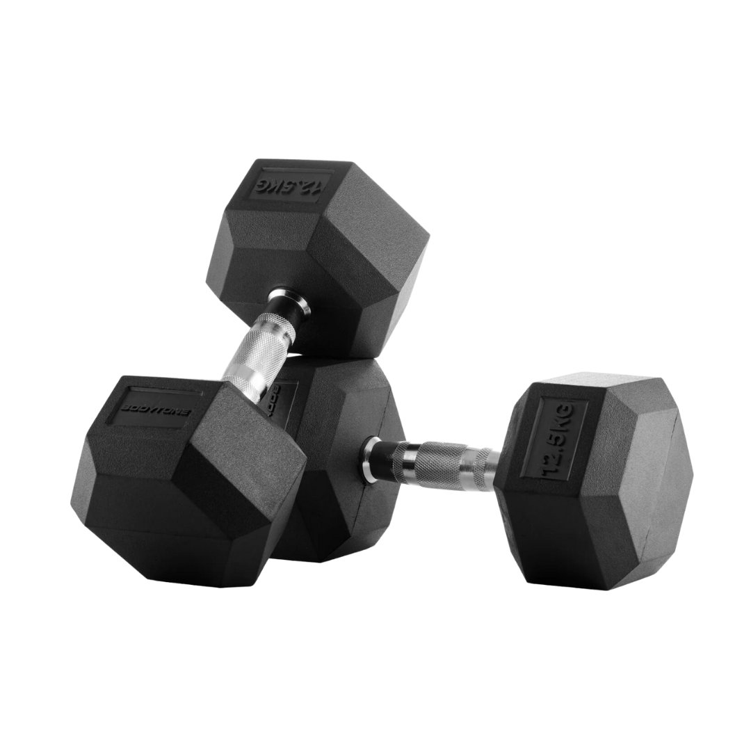Mancuernas hexagonales de goma (caucho 100% de alta calidad) con agarres de acero cromado, antideslizantes para mayor adherencia ideales para entrenamientos de musculación de alta calidad en gimnasios y boxs.
