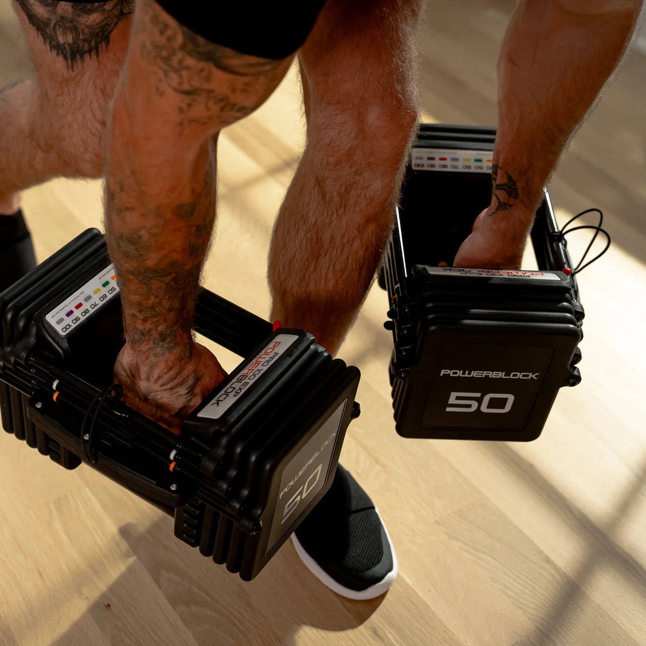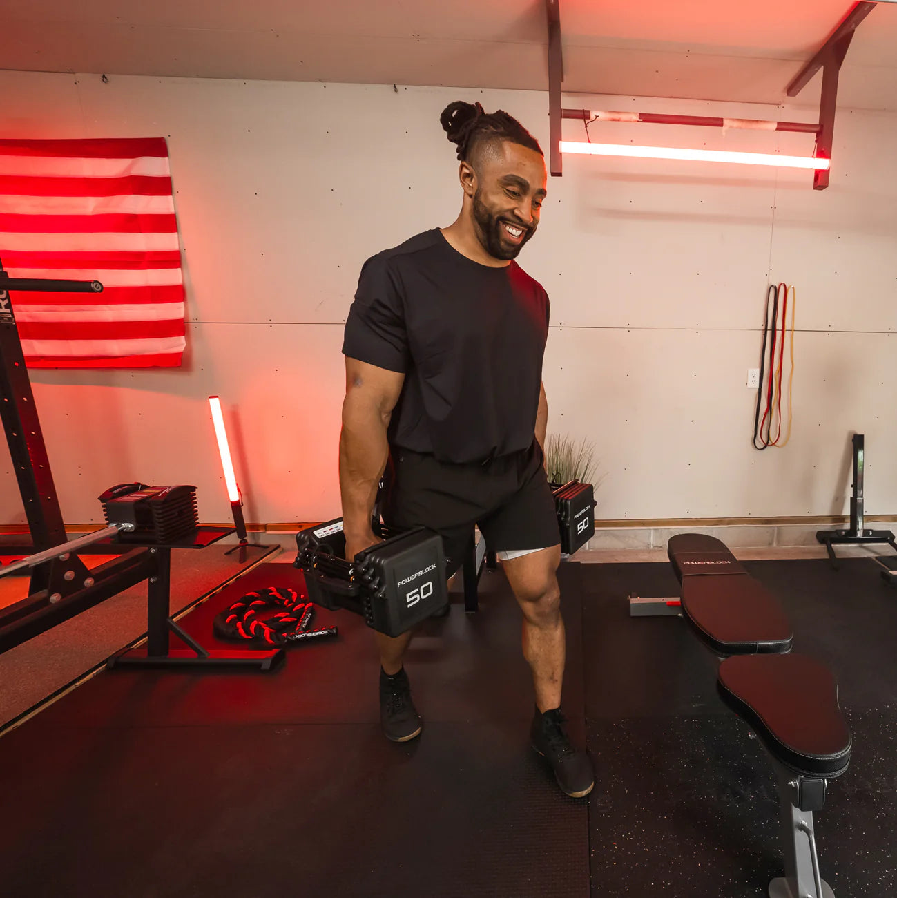 El juego de mancuernas ajustables PowerBlock Pro 100 EXP te brinda el entrenamiento perfecto en cualquier momento.