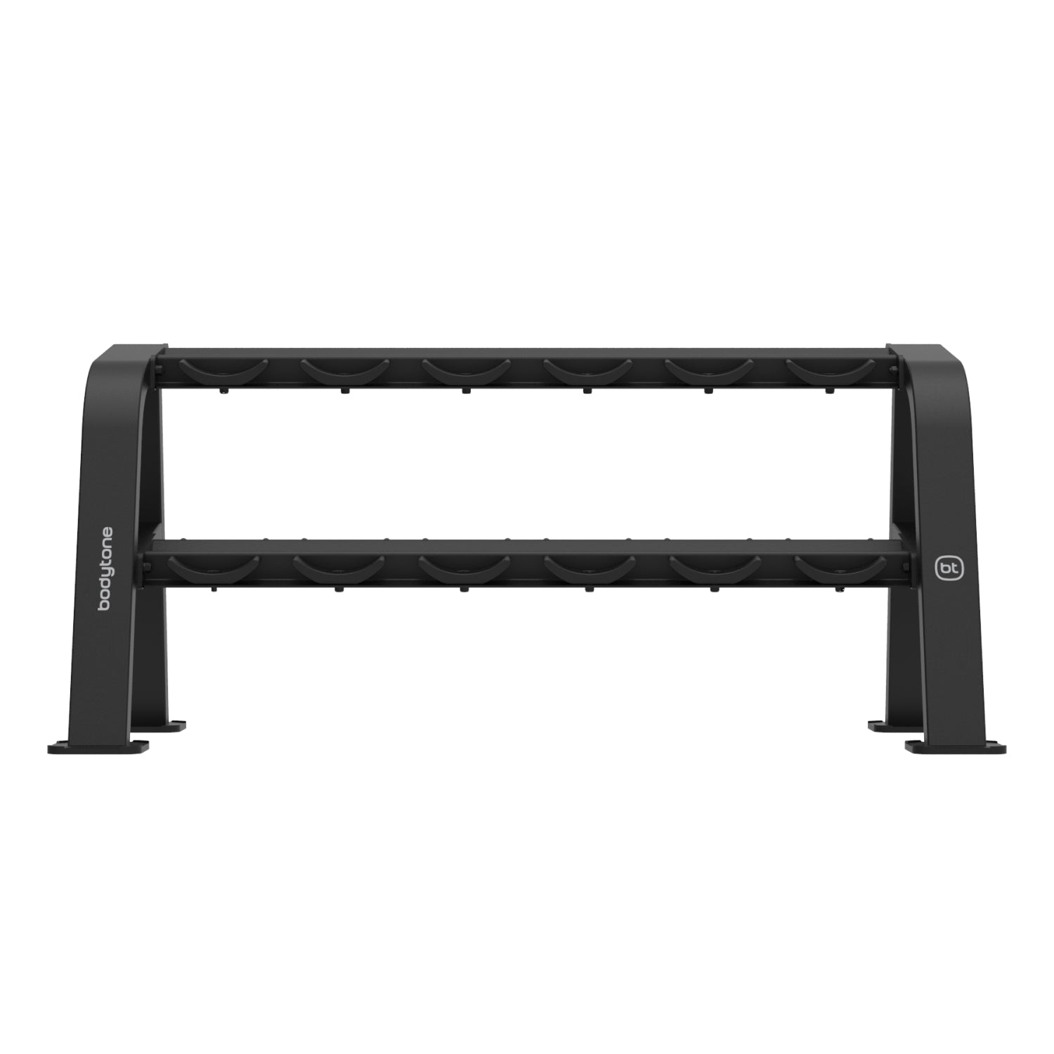 El FR06 es un mancuernero capaz de almacenar hasta 300 kg de carga. Gracias a sus 12 localidades podrás almacenar hasta 6 pares de mancuernas en él, consiguiendo un espacio de entrenamiento seguro y ordenado.