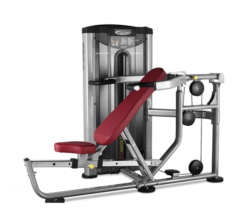 Características- Esta máquina permite realizar un doble ejercicio: press de pecho (horizontal e inclinado) y press de hombros.