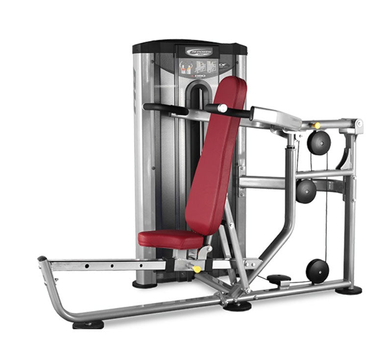 La L080B permite la realización de un doble ejercicio (dual function): press de pecho (horizontal e inclinado) y de hombro. De esta forma, se pueden aprovechar los espacios de una forma óptima manteniendo la oferta de trabajo específico de grupos musculares.