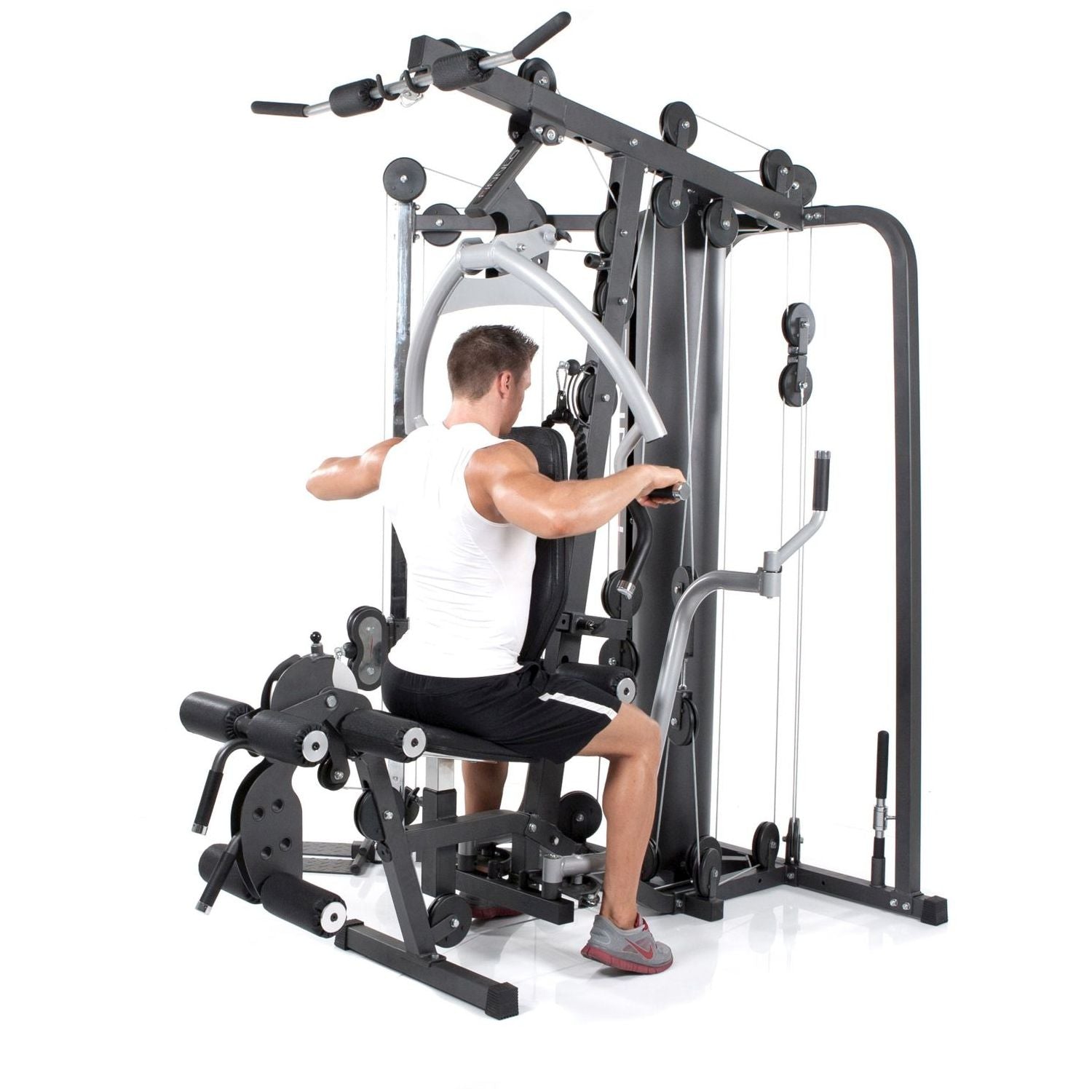 Incluye función de extensión/flexión de piernas, unidad de mariposa independiente y sistema de rodillos regulable en altura y capaz de girar 160°, para un entrenamiento muscular eficiente.