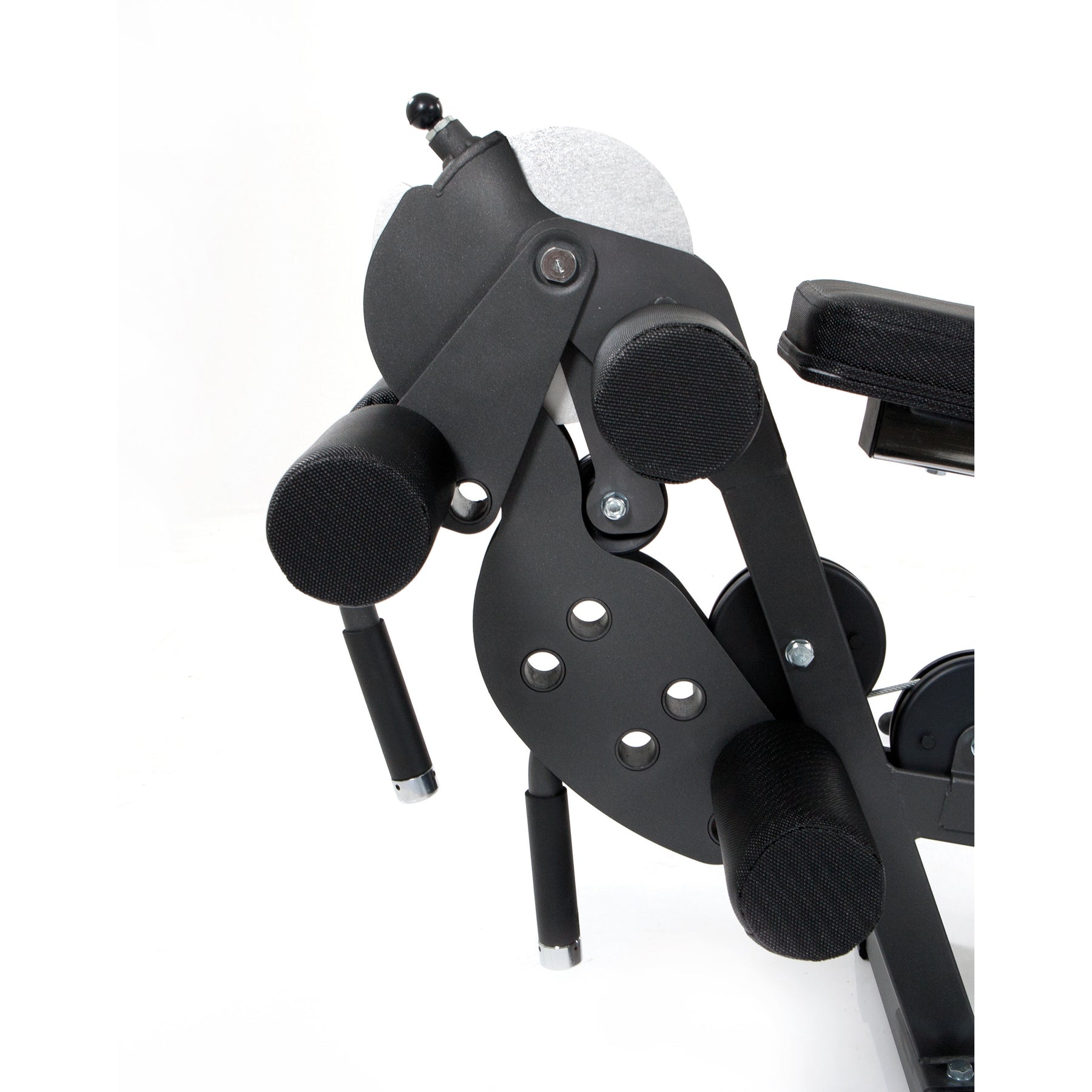 Extensión/flexión de piernas, unidad de mariposa independiente y press de pierna con una gran placa metálica.