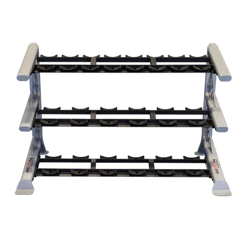 Los soportes para mancuernas SDKR1000SD tienen lugares designados para cada tamaño de mancuernas, lo que crea una exhibición ordenada y organizada de mancuernas. El diseño curvo del sillín también evita que las mancuernas redondas rueden, lo que crea un entorno de entrenamiento más seguro.