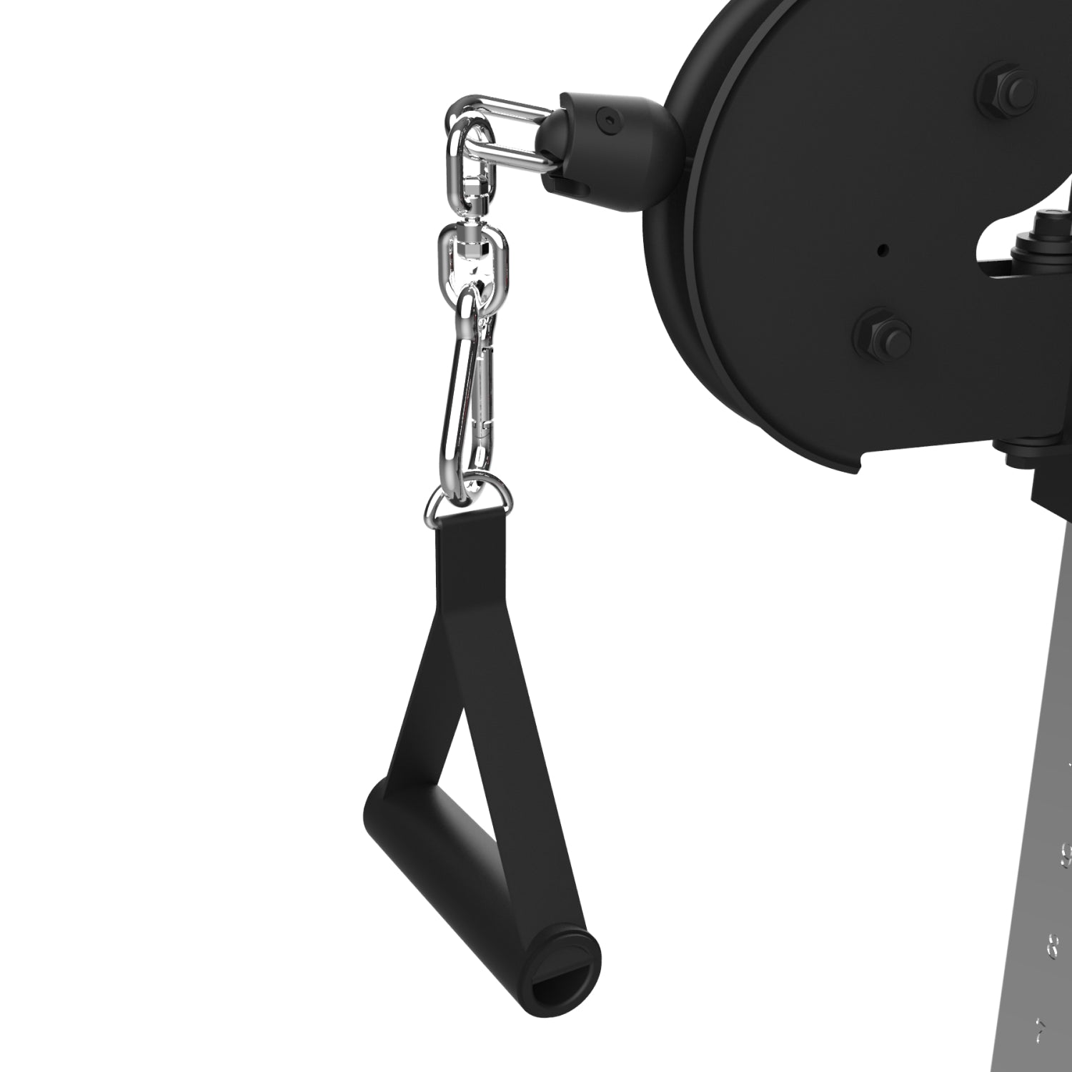 - SUPORTE AJUSTÁVEL PARA PUXADORES: Suporte duplo, com engate antirrotação duplo giratório , com mosquetão para troca do cabo. Polia dupla para execução progressiva do exercício. Ajuste via pino pop em 35 posições.