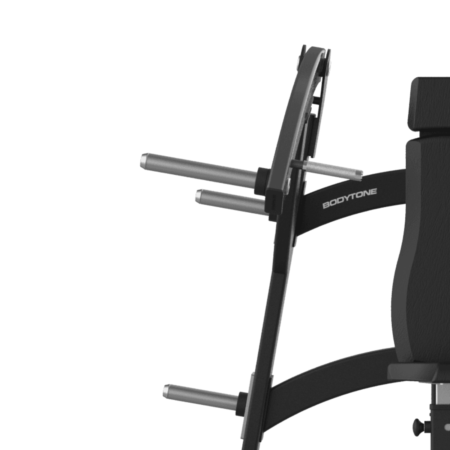 CAPACIDADE DE CARGASuportes de 310 mm para 6 discos Bodytone de 20 kg por braço (até 240 kg para treino). 2 suportes para armazenamento de 4 discos Bodytone de 20 kg por lado.