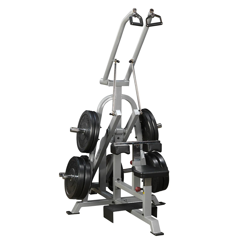 O Body-Solid LVLA Leverage Lat Pulldown tem uma estrutura principal de aço, com acabamento em pó prateado metálico aplicado eletrostaticamente, pontos de articulação de rolamento selados e suportes de peso para armazenamento.